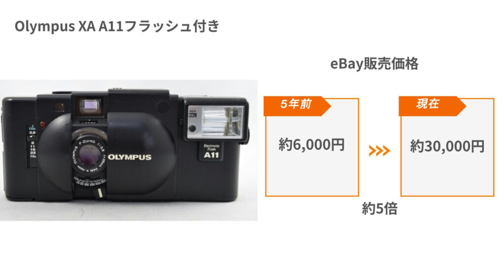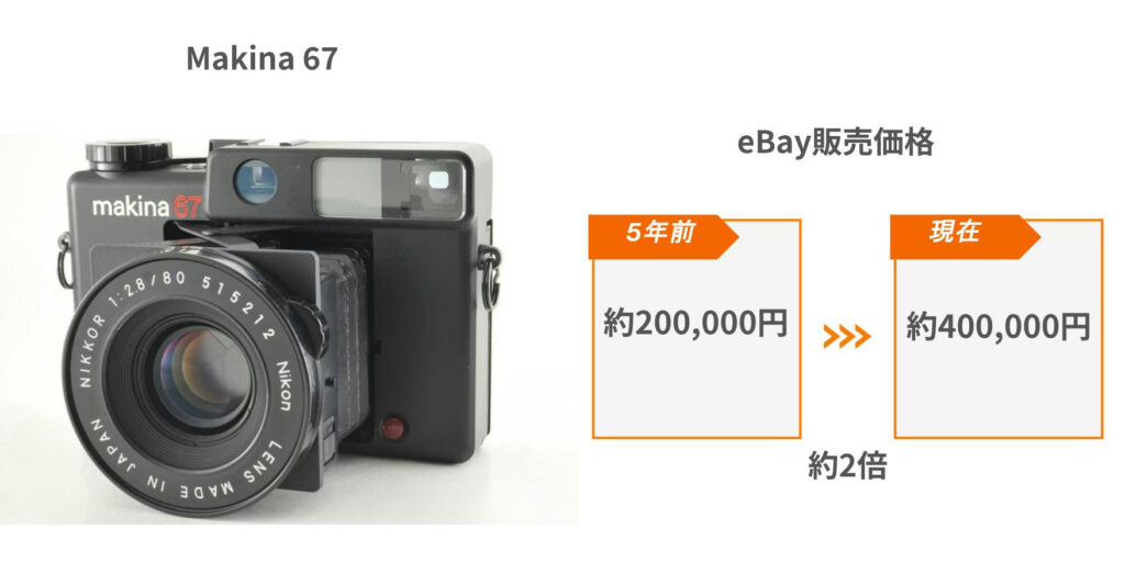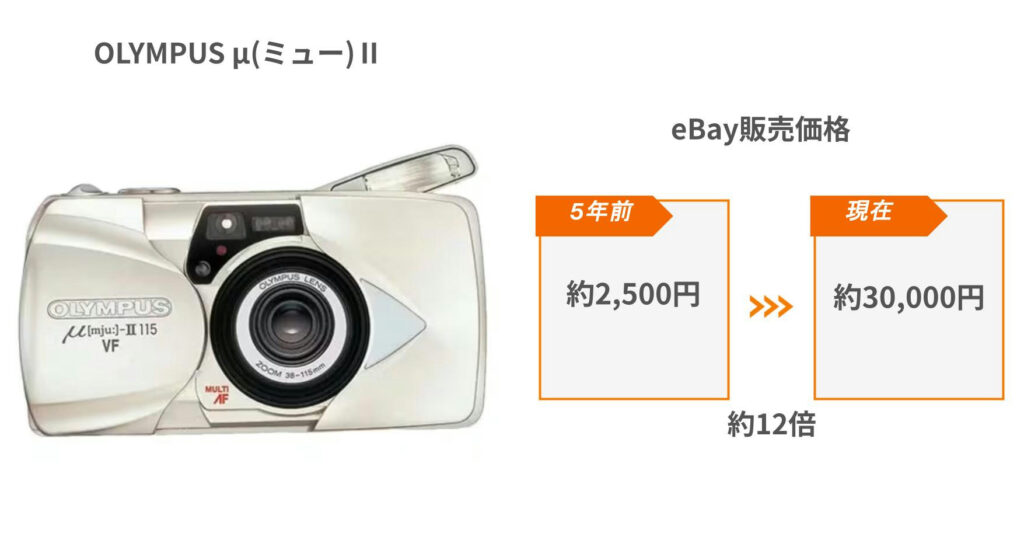 以下はほんの一例ですが、eBayにおけるフィルムカメラの2020年から2026年1月現在(約5年間)の販売価格の変化を示したものです。